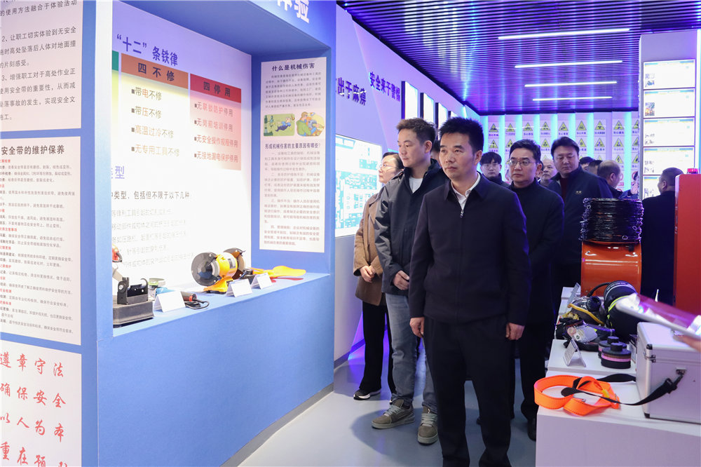 随后,观摩团走进安全警示教育展厅。该展厅以“沉浸体验、筑牢防线”为核心,集安全知识普及、事故案例警示、实操技能训练、安全文化培育于一体。在讲解员引导下,大家依次参观了“安全警钟长鸣”、岗位风险可视化、典型事故案例剖析等板块,并在机械伤害体验、消防器材操作、应急救护训练等互动区域进行交流。展厅配备的安全知识学习考试一体机,内置覆盖各工种的海量题库,保障了从员工到管理层的常态化安全考核,形成“学、练、考、悟”完整闭环,使安全意识和技能深植每位员工心中。