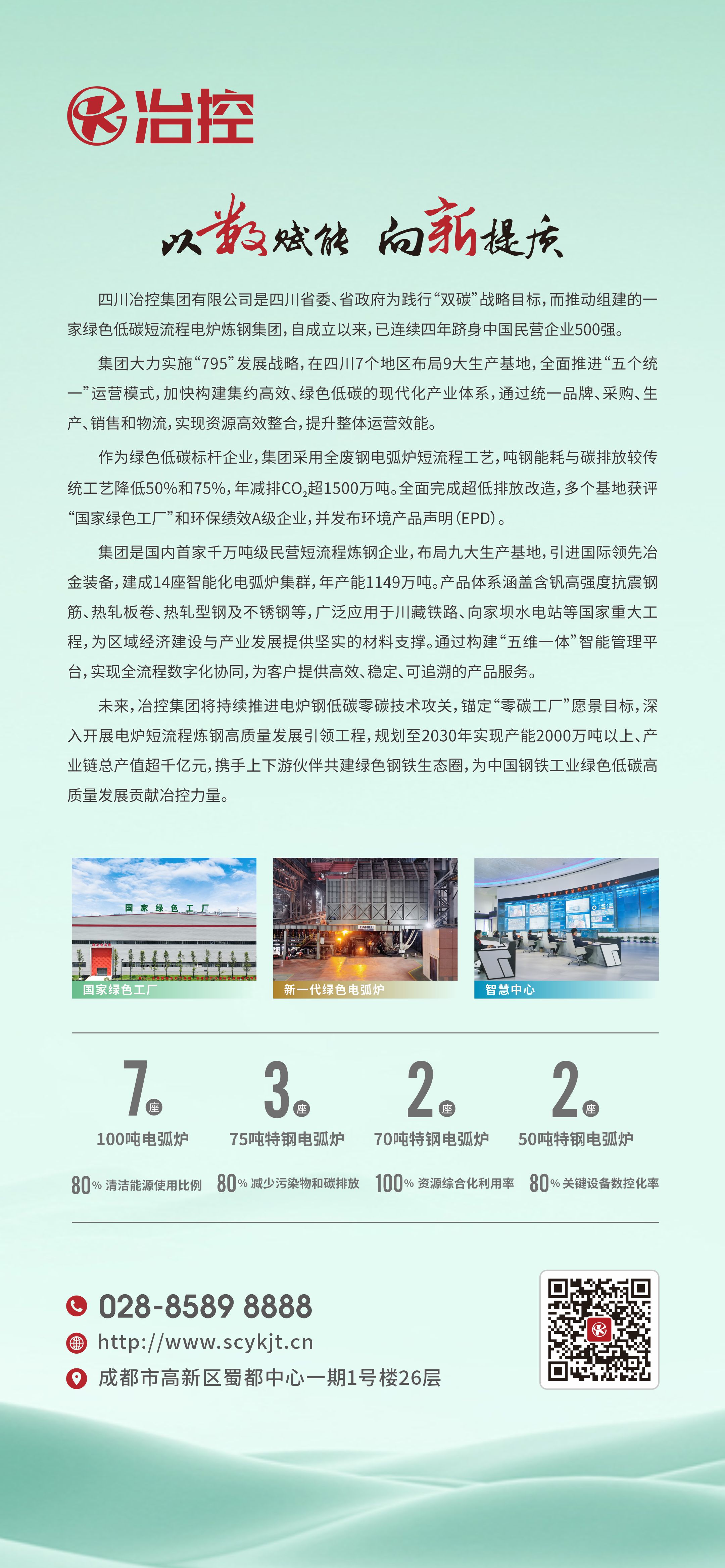 四川冶控集团有限公司(简称冶控集团),是一家专业化全废钢电炉炼钢-连铸-直轧生产工艺、上下游产业链可循环一体化的产业集团。