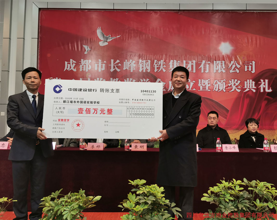 成都市长峰钢铁集团有限公司第二届奖教奖学金成立暨颁奖典... 2020年1月3日,成都市长峰钢铁集团有限公司第二届奖教奖学金成立暨颁奖典礼在都江堰外国语实验学校隆重举行。长峰钢铁集团有限公司董事... 2020-1-7 245
