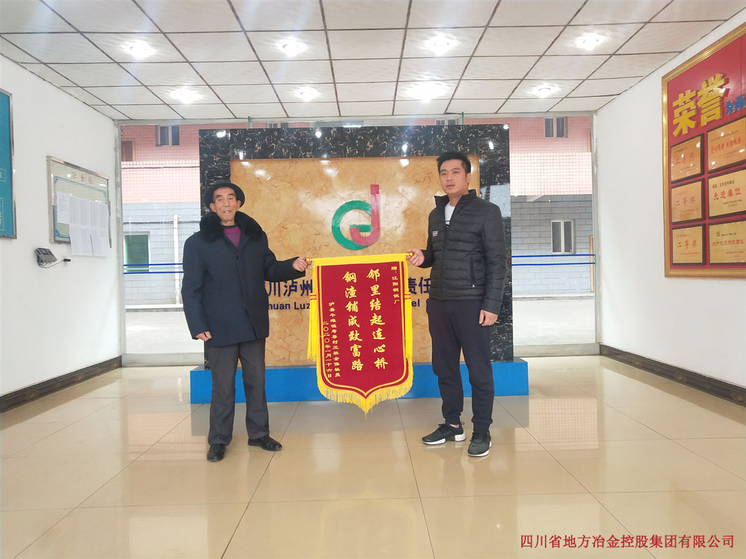 钢渣铺成致富路,邻里结起连心桥——泸州鑫阳钢铁有限公司... 2020年1月13日,泸州市泸县牛滩镇寿尊村三社村民代表徐炳华、张家富、潘尚清将写有“钢渣铺成致富路,邻里结起连心桥”的锦旗送到泸州... 2020-1-14 185
